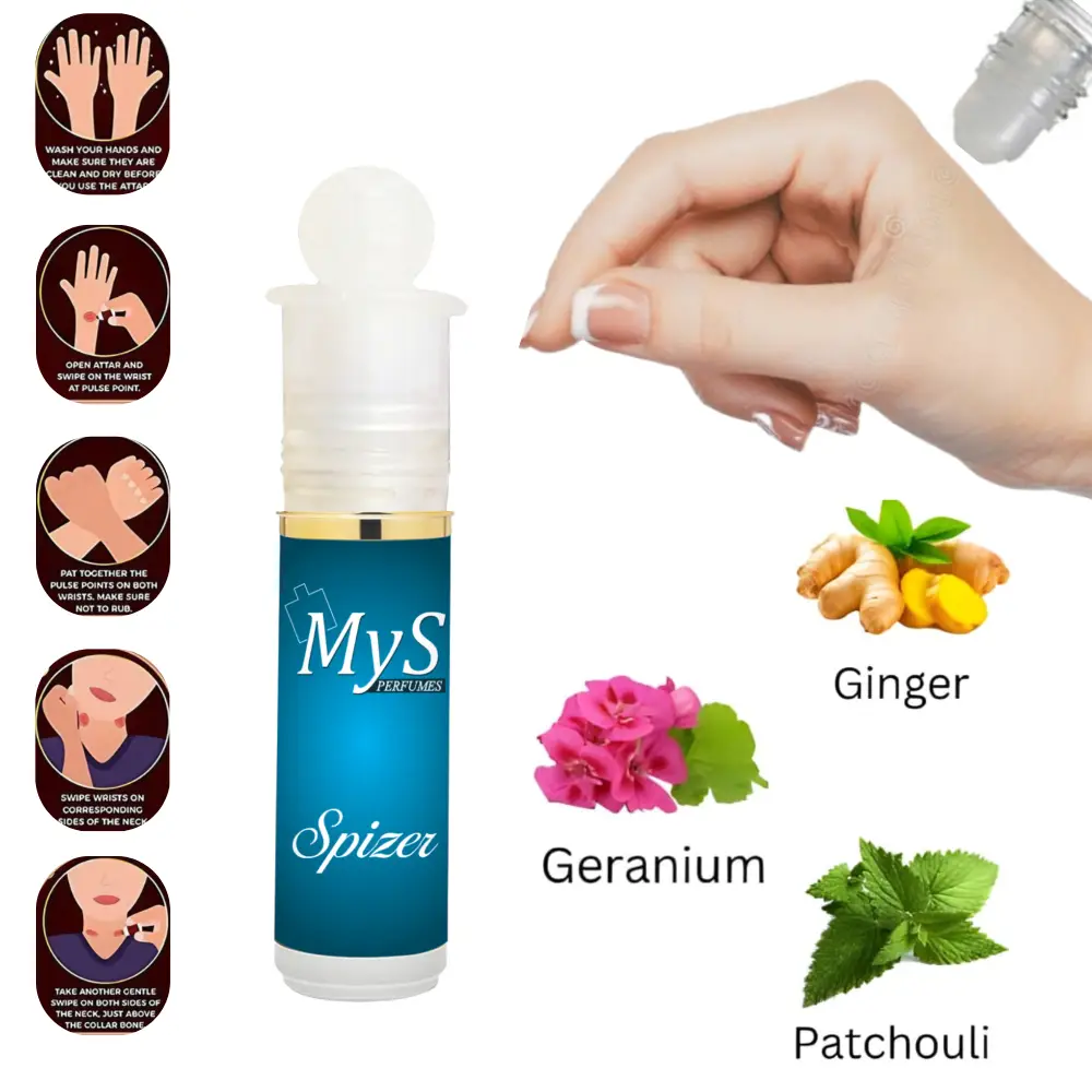 Spizer (6ml Roll-on Attar): This compact roll-on is infused with the rich notes of ginger, geranium, and patchouli. It’s earthy yet fresh, designed for women who prefer a more grounded and comforting scent. The roll-on bottle ensures easy application and is perfect for carrying in your purse or travel kit.