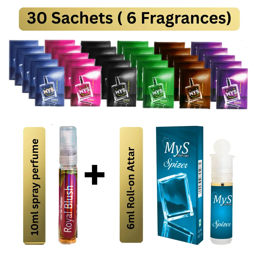 Sachet Attar (30 pieces): A collection of 6 unique fragrances, with 5 sachets each (6 x 5 = 30 sachets). Ideal for handbags, travels, , these perfumed sachets each carefully crafted to delight your senses with their rich, long-lasting scents. These non-alcoholic, skin-safe perfumes are ideal for those who seek the benefits of traditional attars without the hassle.