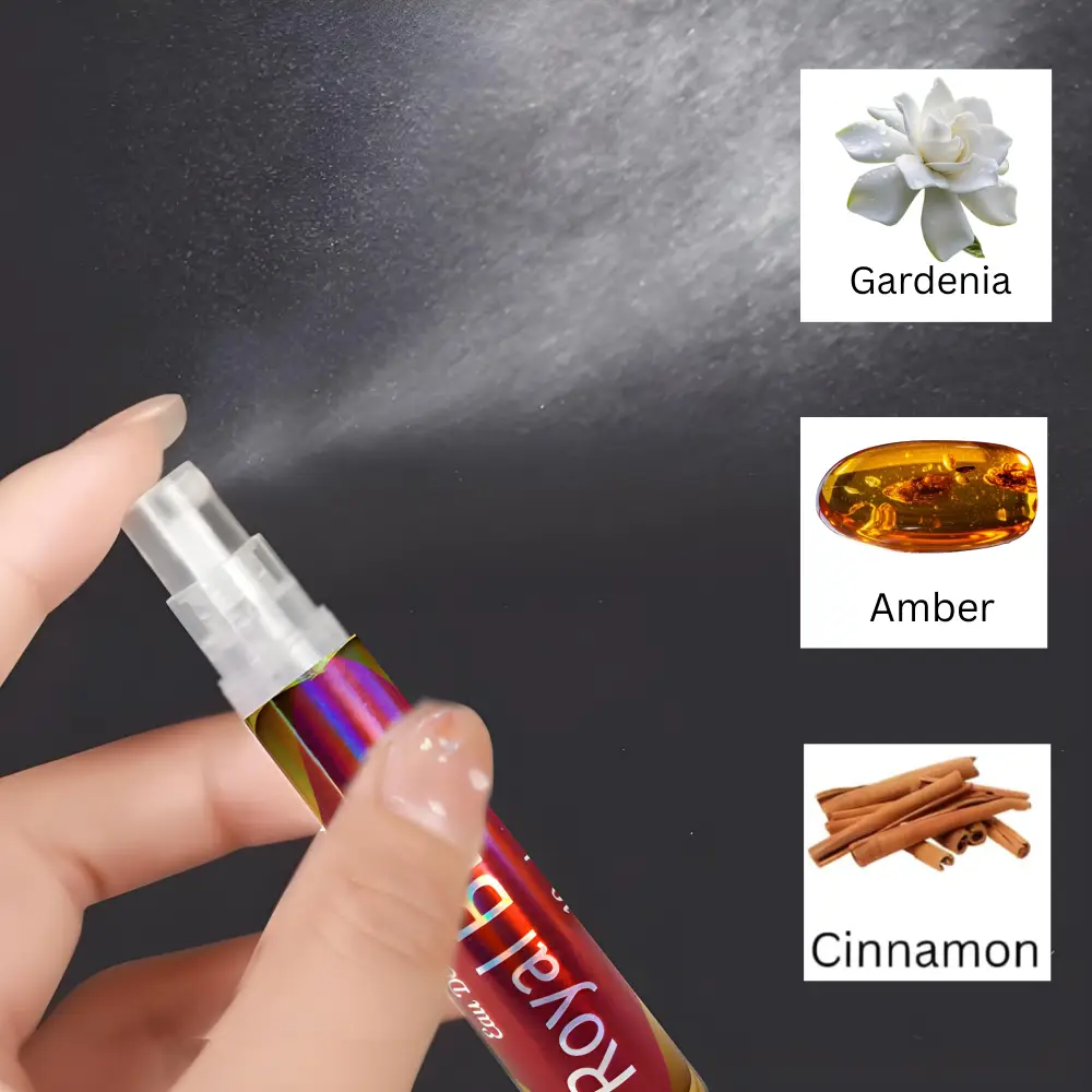 Royal Blush (10ml Spray Perfume): A delicate blend of gardenia, amber, and cinnamon, Royal Blush is soft yet captivating. The floral warmth is enhanced with a touch of spice, making it perfect for daily wear. With just a few sprays, you’ll enjoy a refined, feminine scent that lasts through the day.